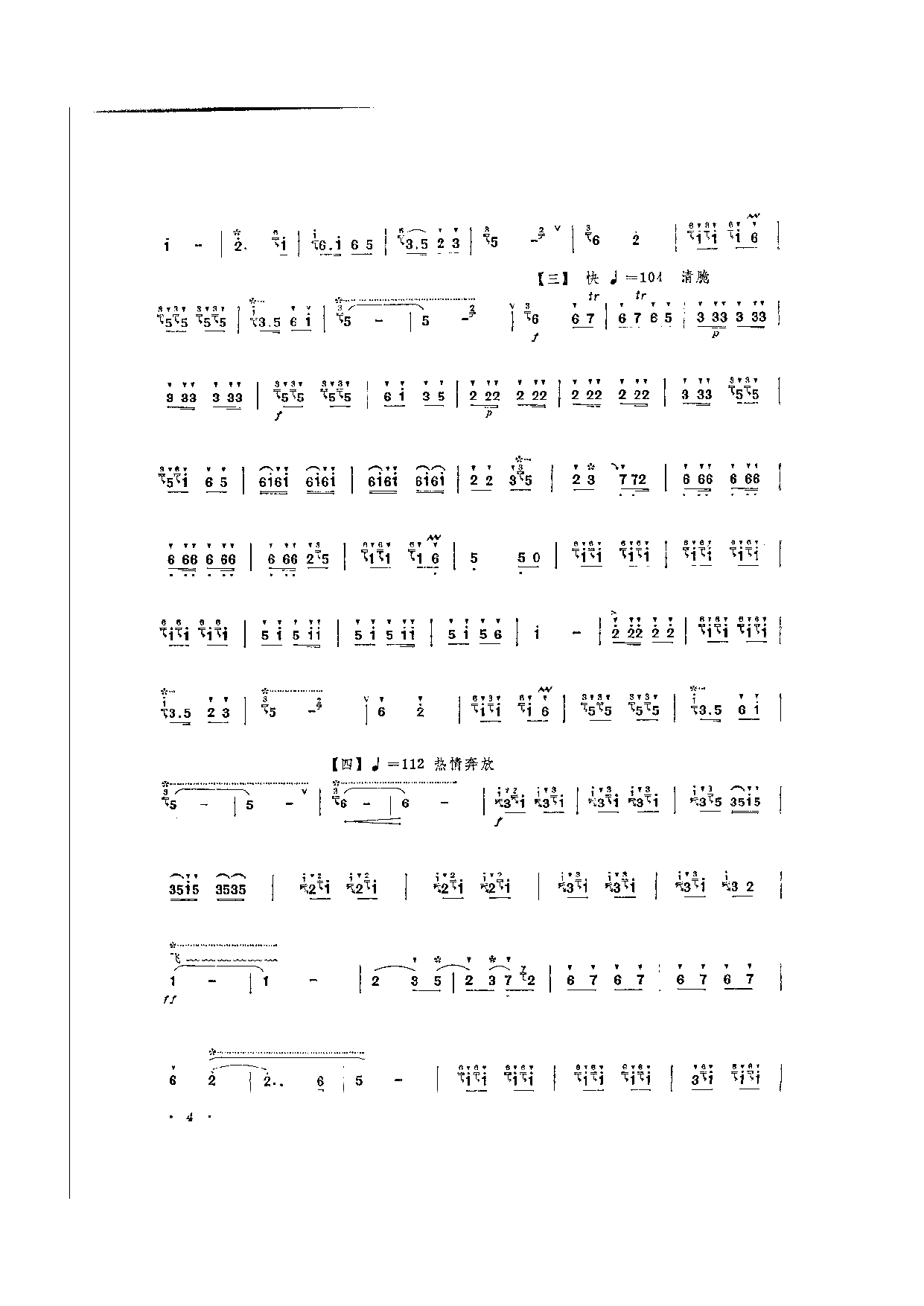 乐曲第二至四段是第一段主题的变奏。一】慢板,曲调优美委婉如歌,具有酒脱的语言化特点和北方人民豪爽乐观的性格特征。二】明决有力又诙谐风趣。三】轻快流利、欢欣活泼。】热情奔放。整个乐曲充满乐观向上、层层问前推进的力。