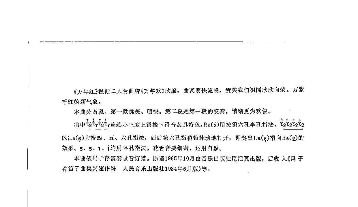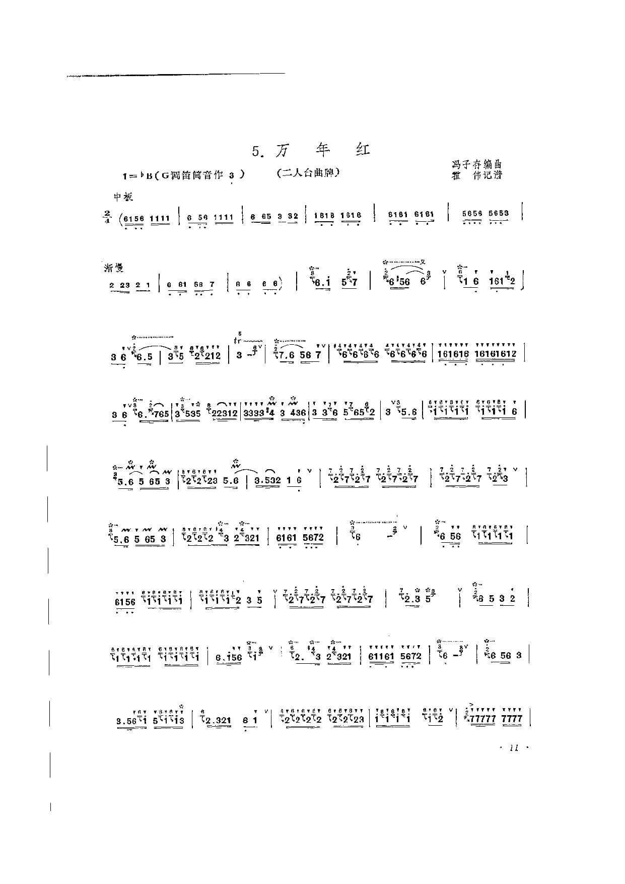 名称:笛子独奏曲简谱:万年红 冯子存编曲 霍伟记谱 附教学及赏析国家:中国分类:民族乐器谱子类:笛子谱类型:简谱文件格式:jpg《万年红》根据二人台曲牌《万年欢》改编,曲调明快流畅,赞美我们祖国欣欣向荣、万紫千红的新气象。本曲分两段。第一段优美、明快。第二段是第一段的变奏,情绪更为欢快。
