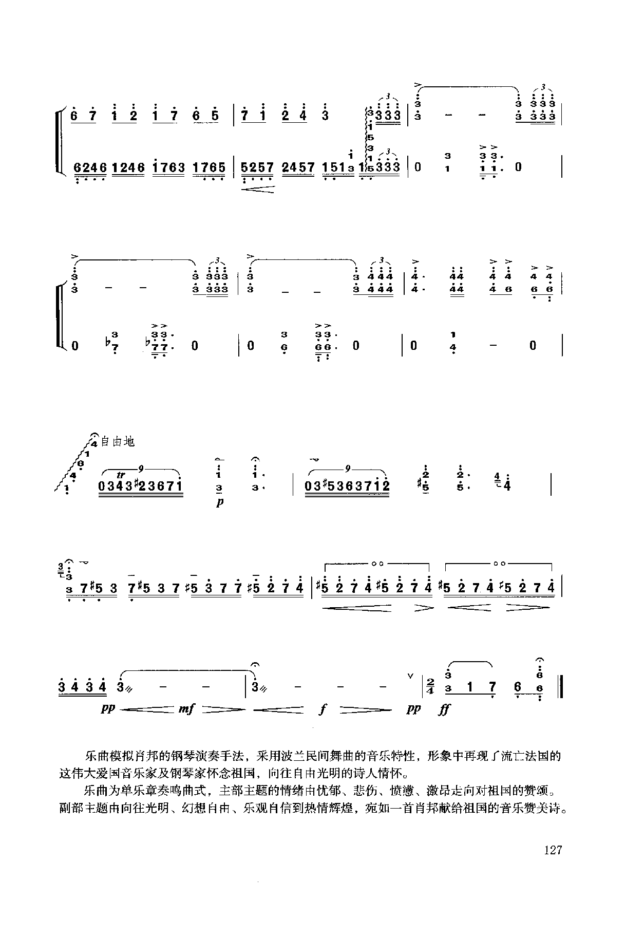 乐曲模拟肖邦的钢琴演奏手法,采用波一民间舞曲的音乐特性,形象中再现了流亡法国的这伟大爱国音乐家及钢琴家怀念祖国,向往自由光明的诗人情怀。乐曲为单乐章奏鸣曲式,主部主题的情绪由忧郁、悲伤、愤懑、激昂走向对祖国的赞颂。副部主题由向往光明、幻想自由、乐观自信到热情辉煌,宛如一首肖邦献给祖国的音乐赞关诗。