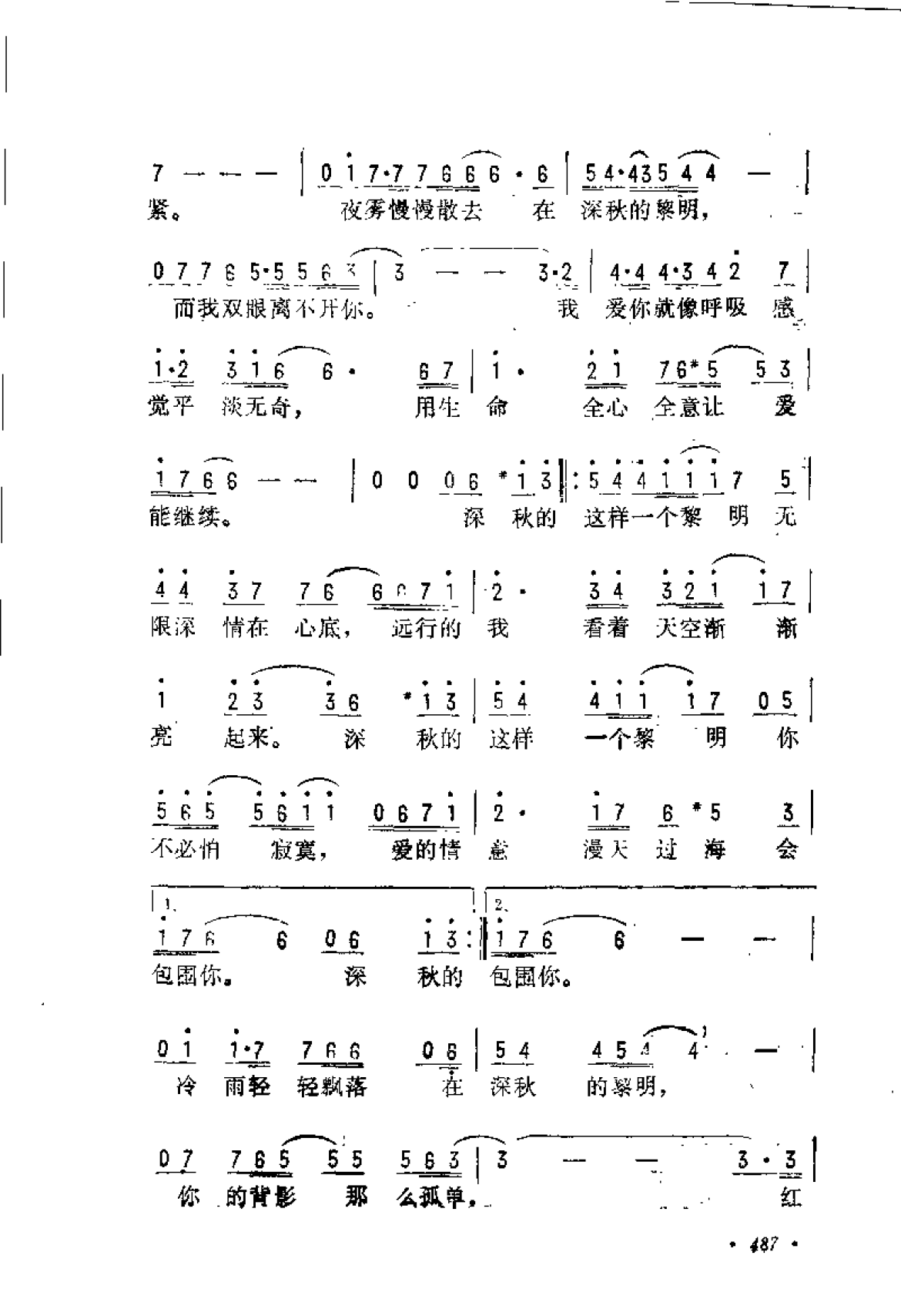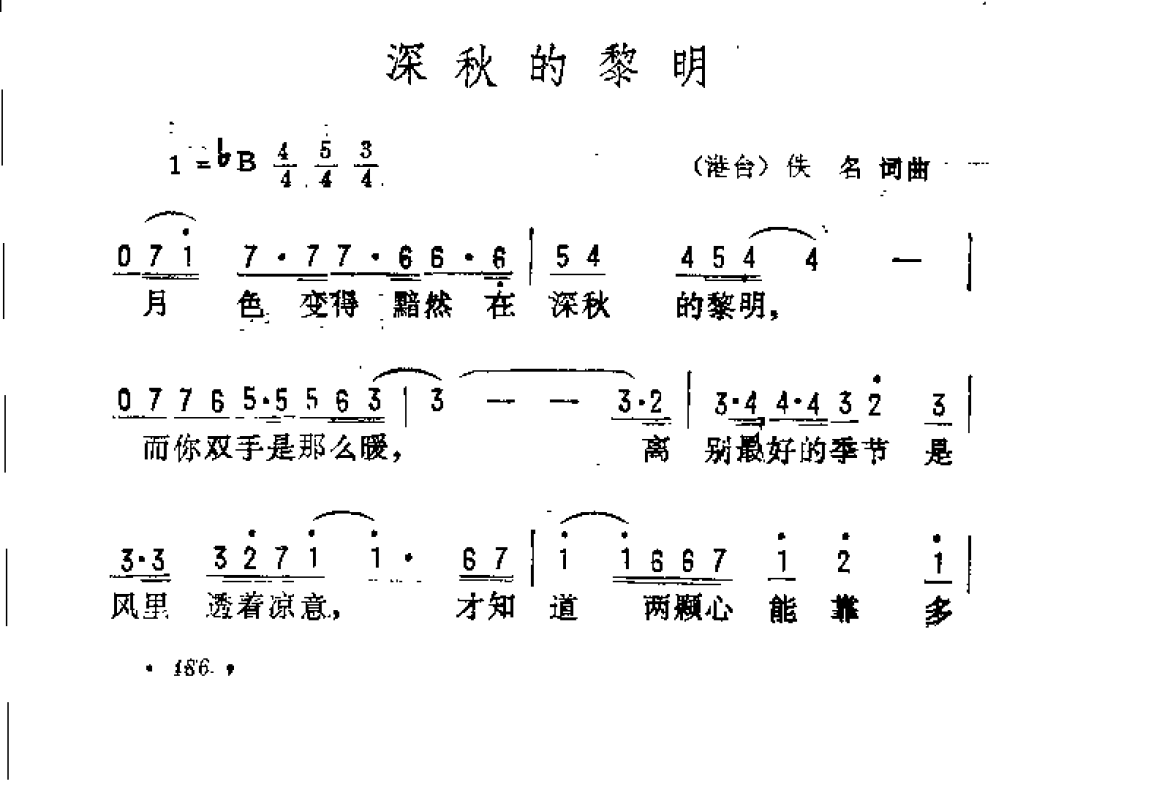 深秋的黎明(港台)佚名词曲简谱歌词是曲谱查询网于2025年02月13日 14:41:22更新在曲谱投稿频道中的内容,收录在曲谱投稿栏目中;曲谱查询网分享的深秋的黎明(港台)佚名词曲简谱五线谱高清图片,欢迎在线免费下载;曲谱查询网无需注册,即可直接下载海量歌曲谱与乐器学习相关资料。