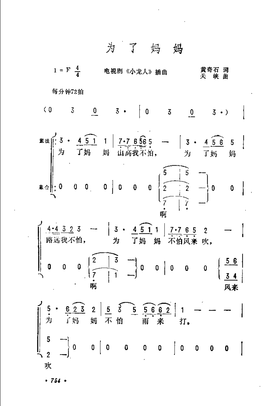 为了妈妈(电视剧《小龙人》插曲)黄奇石词 关峡曲