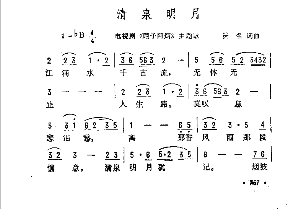 清泉明月(电视剧《瞎子阿炳》主题歌)佚名词曲简谱歌词是曲谱查询网于2025年02月14日 20:47:53更新在曲谱投稿频道中的内容,收录在曲谱投稿栏目中;曲谱查询网分享的清泉明月(电视剧《瞎子阿炳》主题歌)佚名词曲简谱五线谱高清图片,欢迎在线免费下载;曲谱查询网无需注册,即可直接下载海量歌曲谱与乐器学习相关资料。