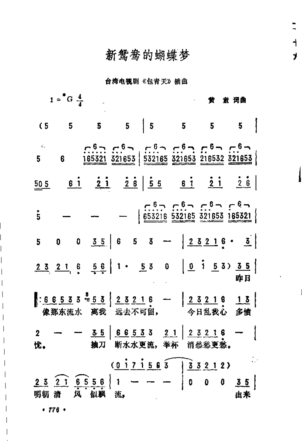 新鸳鸯的蝴蝶梦(台湾电视剧《包青天》插曲)黄童词曲简谱歌词是曲谱查询网于2025年02月14日 20:56:57更新在曲谱投稿频道中的内容,收录在曲谱投稿栏目中;曲谱查询网分享的新鸳鸯的蝴蝶梦(台湾电视剧《包青天》插曲)黄童词曲简谱五线谱高清图片,欢迎在线免费下载;曲谱查询网无需注册,即可直接下载海量歌曲谱与乐器学习相关资料。
