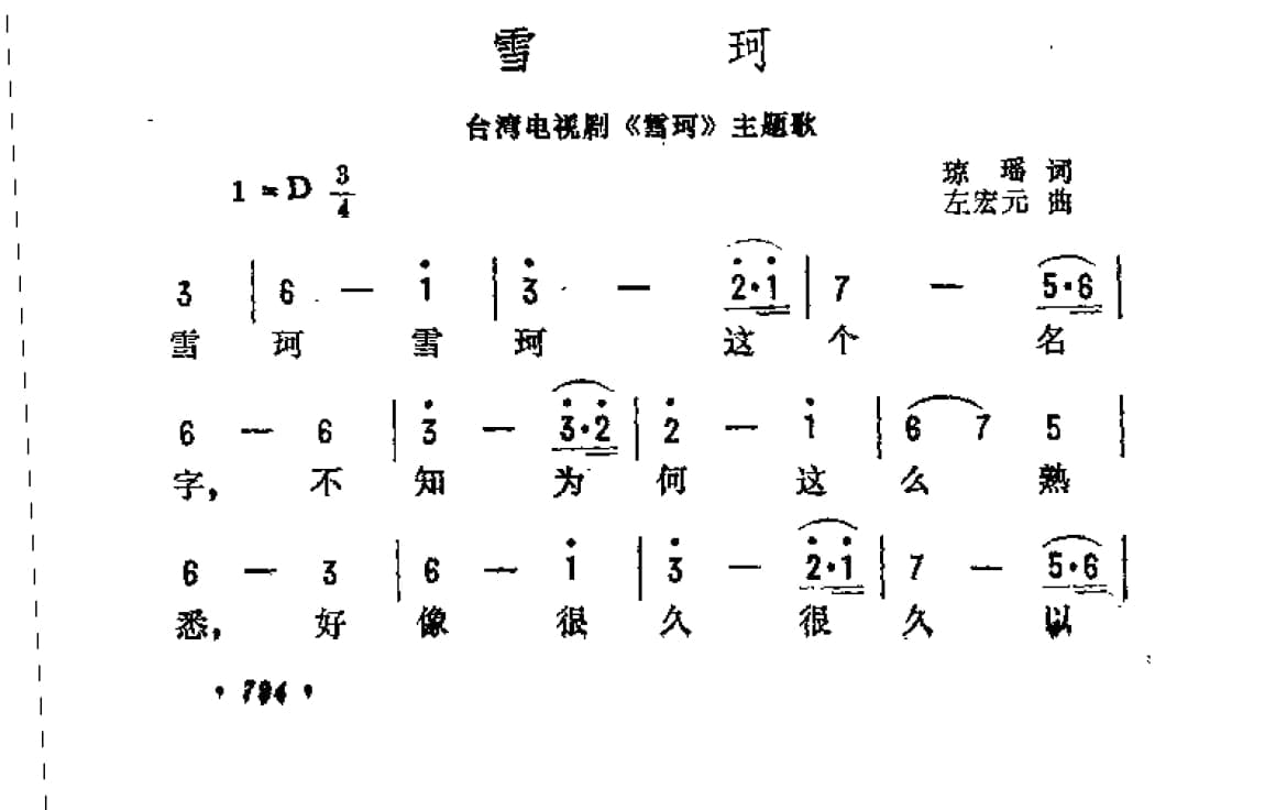 名称:雪珂 台湾电视剧 雪珂 主题歌 琼瑶词 左宏元曲国家:中国分类:曲谱子类:投稿类型:简谱/五线谱文件格式:jpg