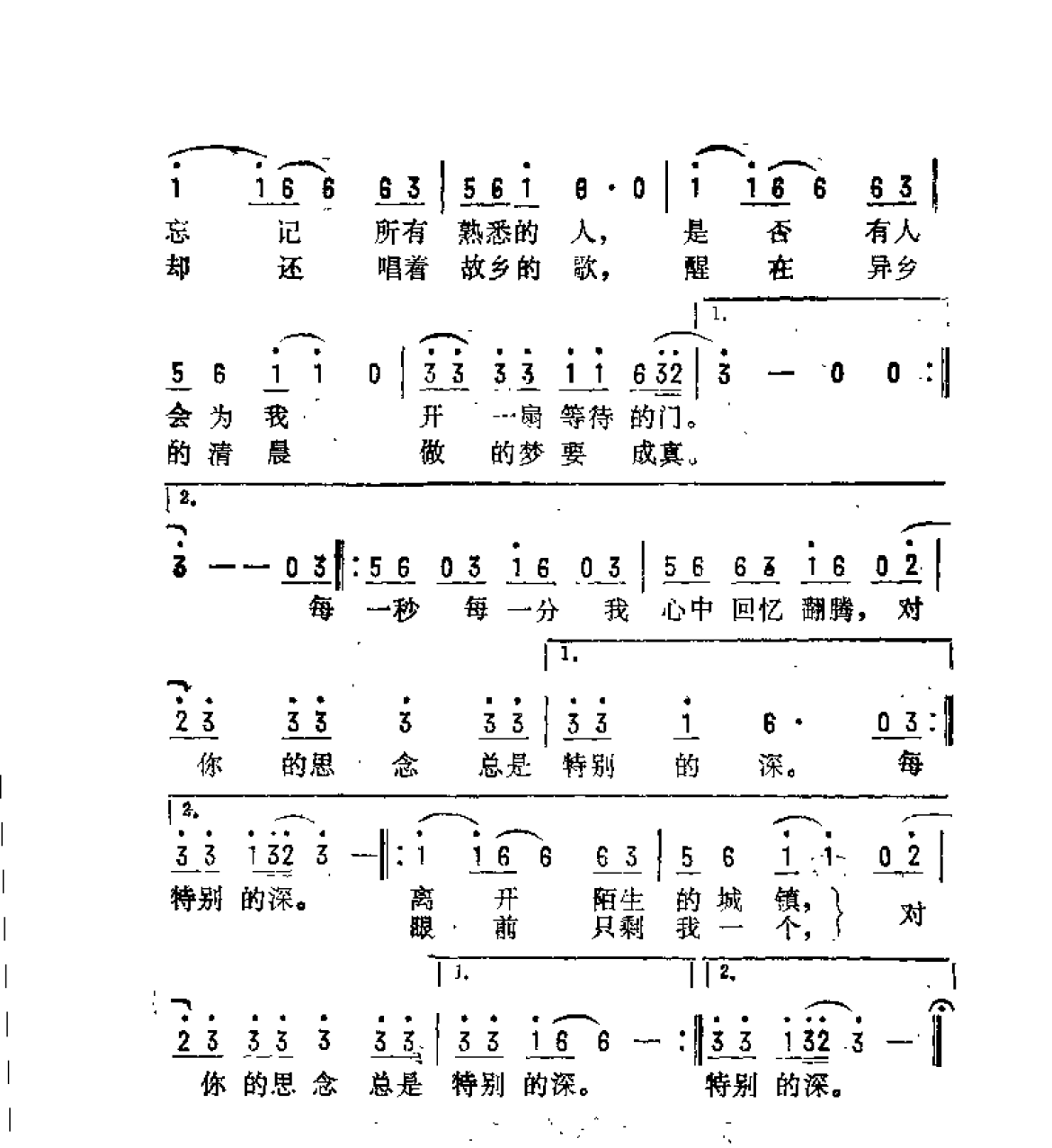 对你的思念特别的深(台湾)郑华娟、陈容森词 陈容森曲简谱歌词是曲谱查询网于2025年02月13日 13:59:55更新在通俗歌曲谱频道中的内容,收录在通俗歌曲谱栏目中;曲谱查询网分享的对你的思念特别的深(台湾)郑华娟、陈容森词 陈容森曲简谱五线谱高清图片,欢迎在线免费下载;曲谱查询网无需注册,即可直接下载海量歌曲谱与乐器学习相关资料。