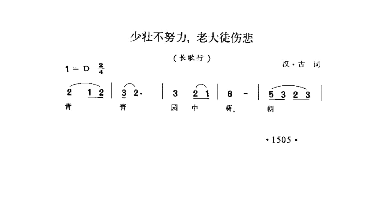 名称:少壮不努力,老大徒伤悲 长歌行 汉 古词国家:中国分类:声乐谱子类:民族唱法歌谱类型:简谱/五线谱文件格式:jpg