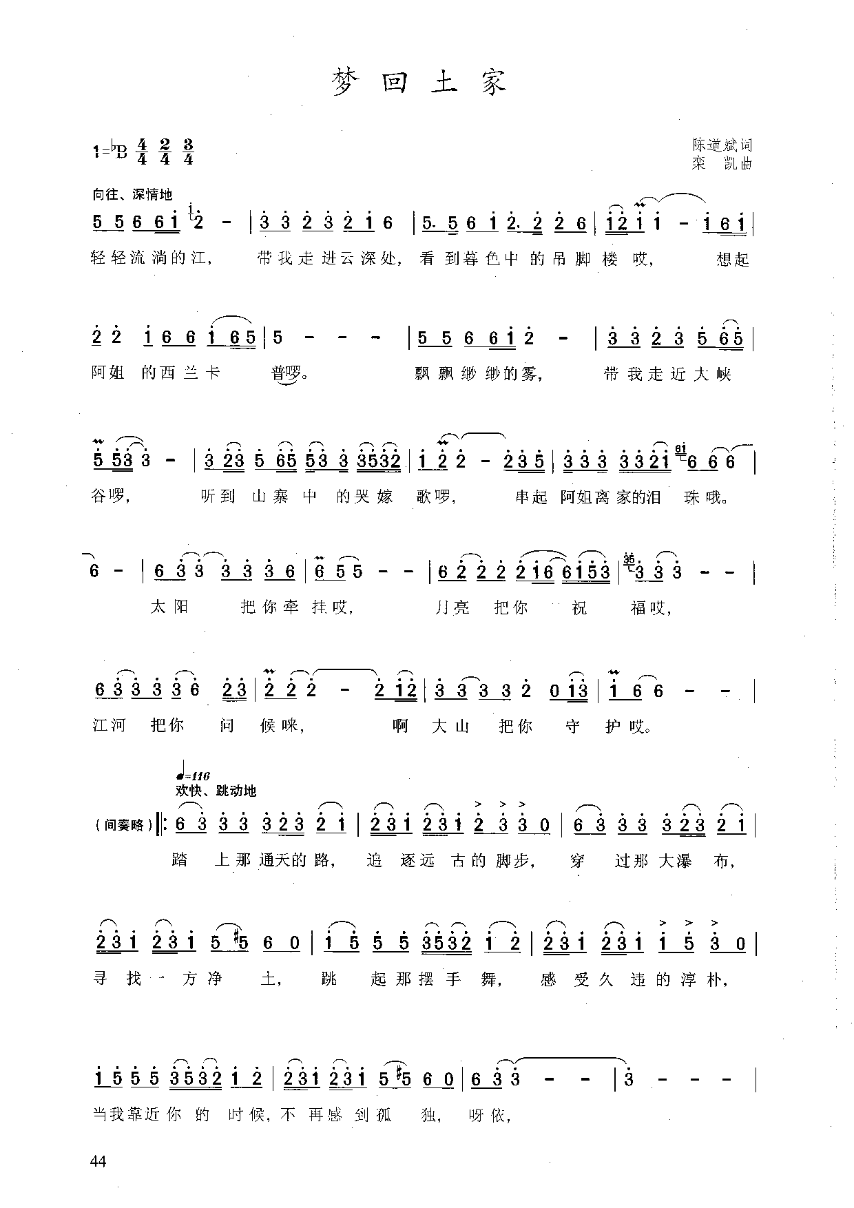 歌曲简谱:梦回土家 陈道斌词 栾凯曲