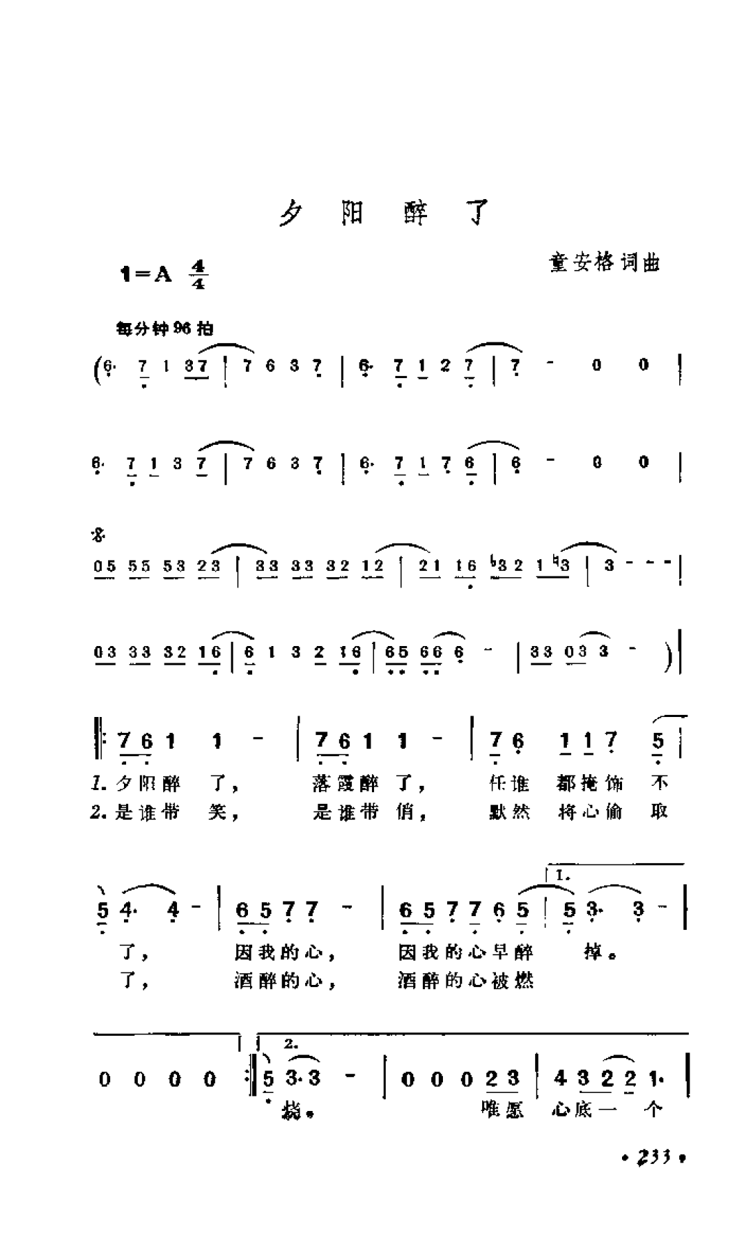 夕阳醉了 童安格词曲简谱歌词是曲谱查询网于2025年01月09日 11:15:59更新在通俗歌曲谱频道中的内容,收录在通俗歌曲谱栏目中;曲谱查询网分享的夕阳醉了 童安格词曲简谱五线谱高清图片,欢迎在线免费下载;曲谱查询网无需注册,即可直接下载海量歌曲谱与乐器学习相关资料。
