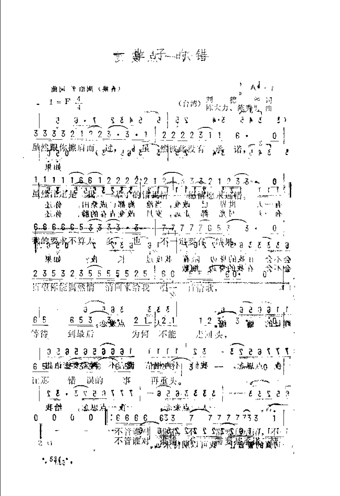 一辈子的错(台湾)刘德华词 陈大力、陈秀男曲简谱歌词是曲谱查询网于2025年02月13日 19:53:42更新在通俗歌曲谱频道中的内容,收录在通俗歌曲谱栏目中;曲谱查询网分享的一辈子的错(台湾)刘德华词 陈大力、陈秀男曲简谱五线谱高清图片,欢迎在线免费下载;曲谱查询网无需注册,即可直接下载海量歌曲谱与乐器学习相关资料。