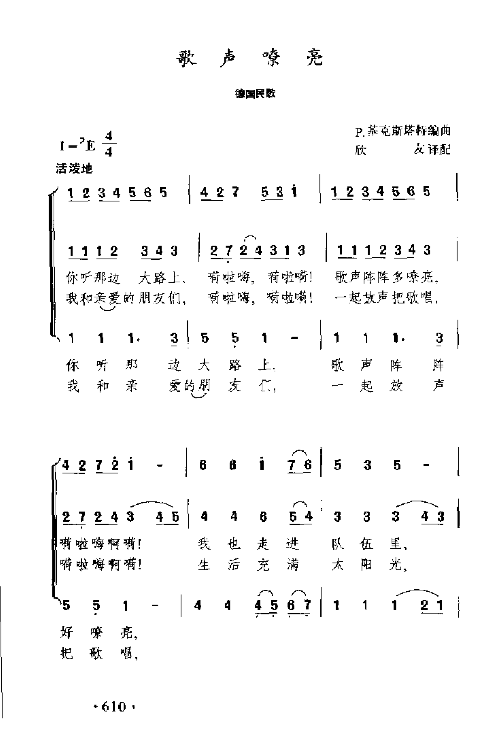 外国民间乐曲简谱:歌声嘹亮 德国民歌简谱歌词是曲谱查询网于2025年02月06日 08:41:56更新在外国曲谱频道中的内容,收录在外国曲谱栏目中;曲谱查询网分享的外国民间乐曲简谱:歌声嘹亮 德国民歌简谱五线谱高清图片,欢迎在线免费下载;曲谱查询网无需注册,即可直接下载海量歌曲谱与乐器学习相关资料。