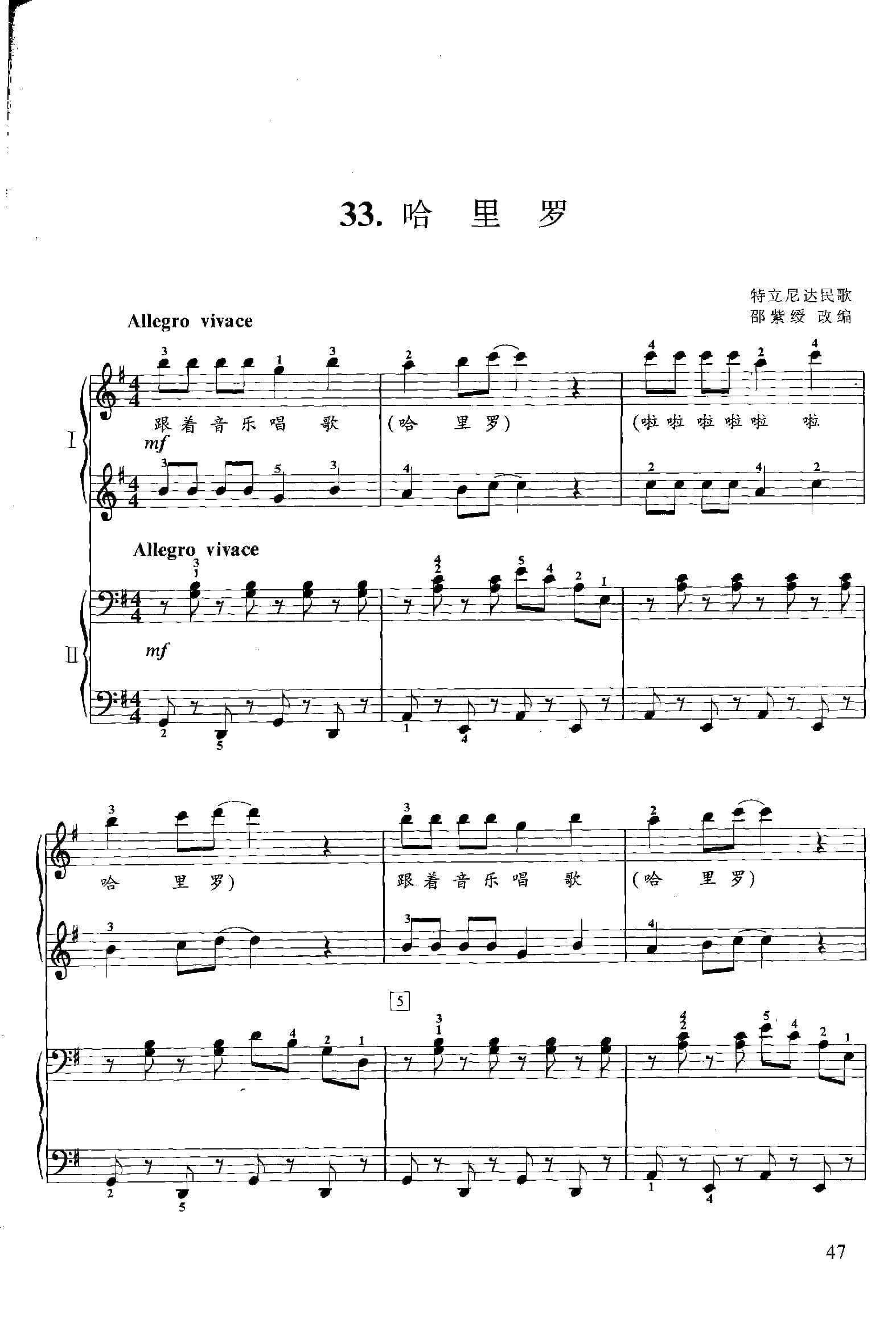 名称:少儿钢琴四手联弹曲目:哈哩罗 特立尼达民歌 邵紫绶改编 五线谱
