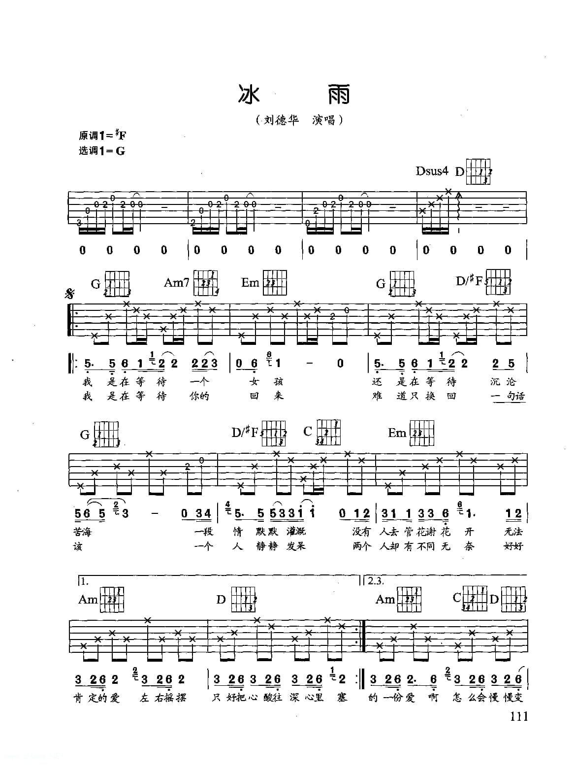 刘德华歌曲吉他六线谱:冰雨(附简谱歌词)