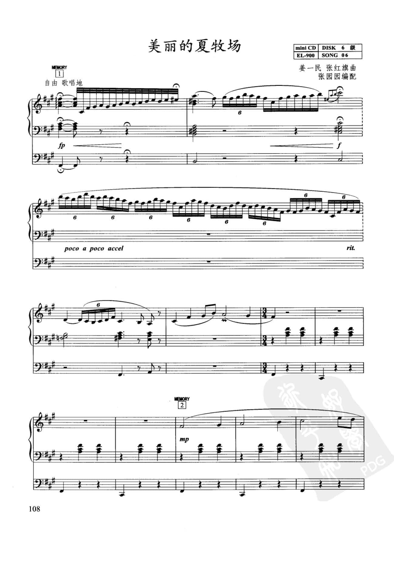 名称:双排键电子琴考级曲目:美丽的夏牧场 姜一民 张红旗曲 张园园编配 六级 五线谱