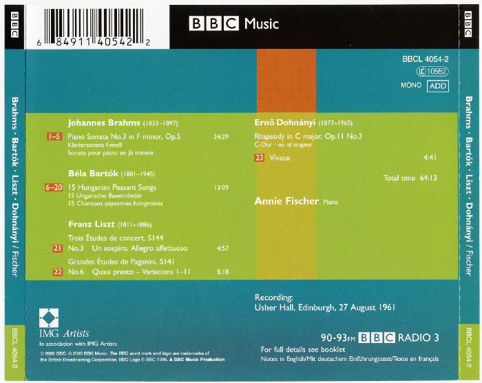 BBC Legends BBCL 4054. Fischer: Brahms - Piano Sonata no.3, Bartok - 15 Hungarian Peasant Songs, Liszt - 2 Etudes, Dognanyi - Rhapsody no.3 (APE)