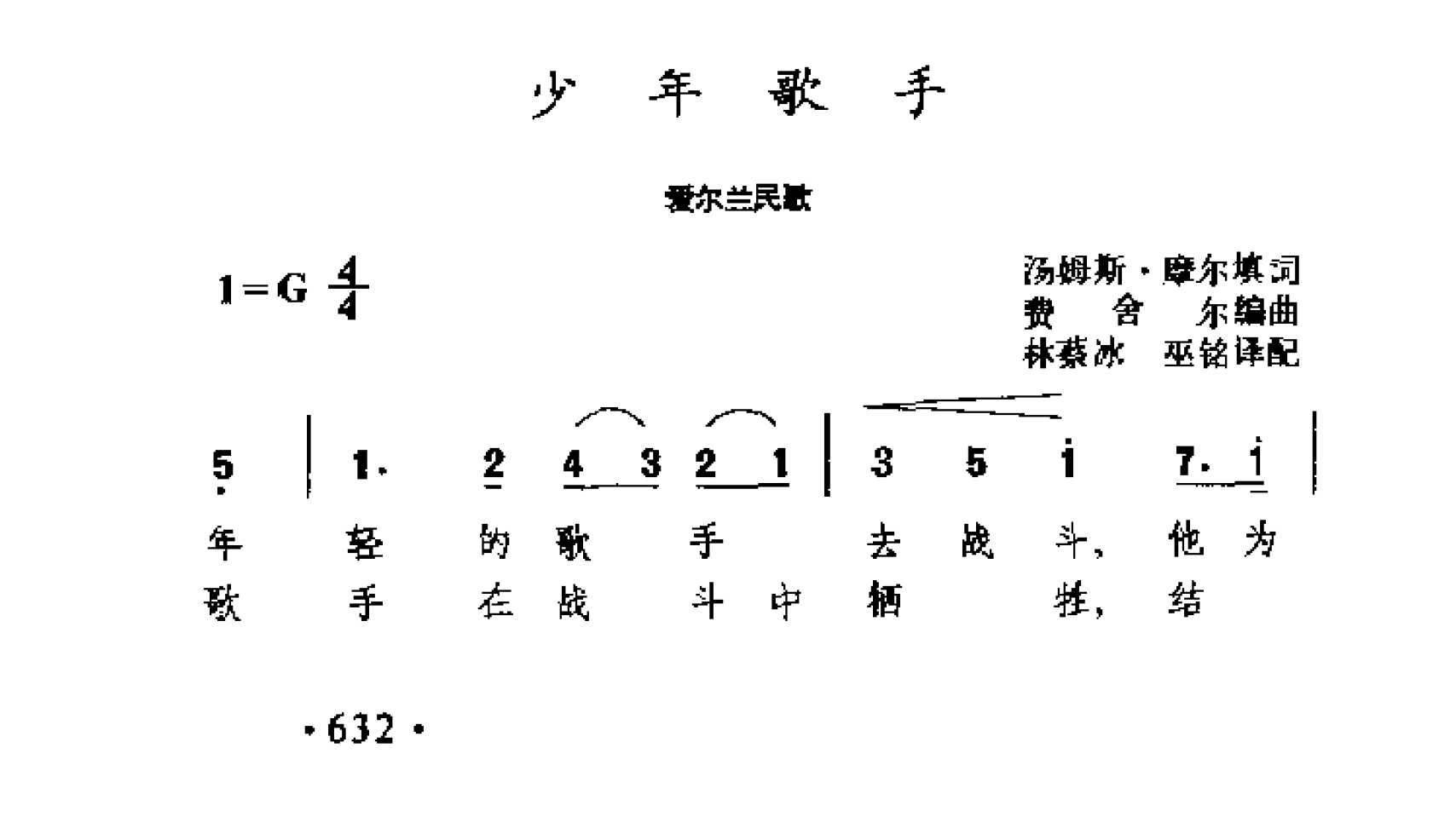 民间歌曲简谱:少年歌手(爱尔兰民歌)
