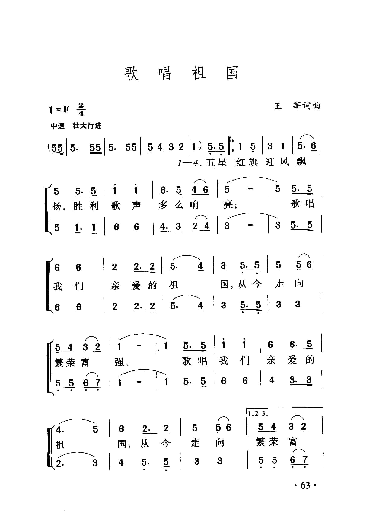 名称:中国名歌500首乐谱:歌唱祖国 王莘词曲国家:中国分类:曲谱子类:歌谱乐谱类型:简谱/五线谱专辑系列:中国名歌500首乐谱文件格式:jpg