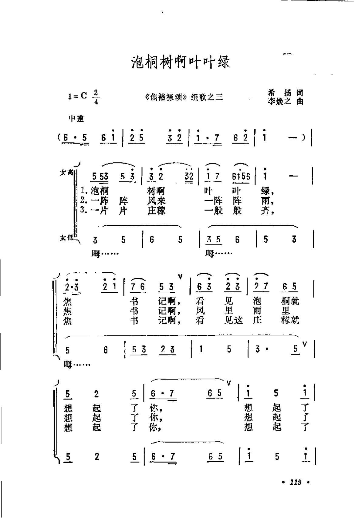 抒情歌曲简谱:泡桐树啊叶叶绿 希扬词 李焕之曲