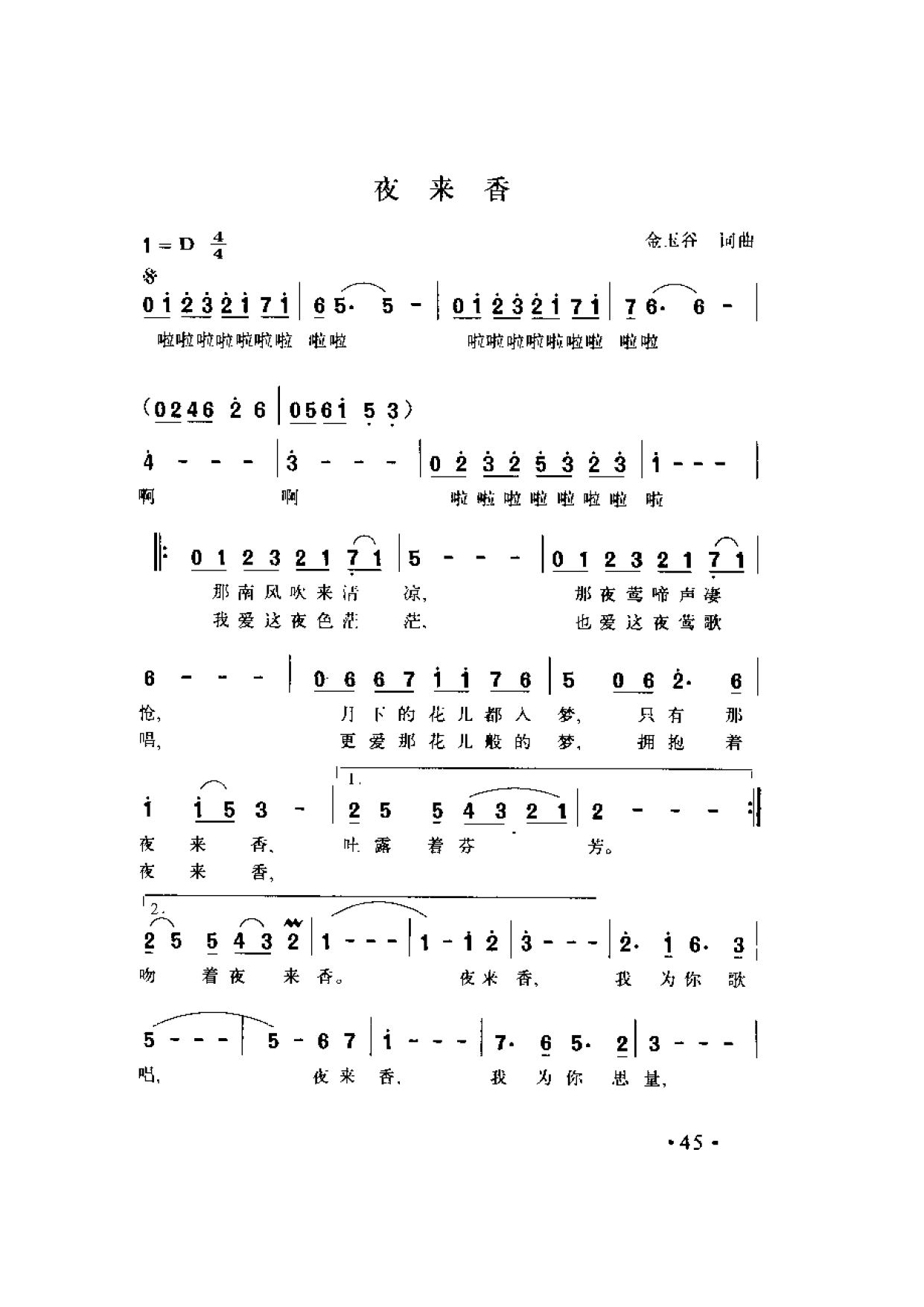 夜来香 金玉谷词曲简谱歌词是曲谱查询网于2025年01月10日 10:51:37更新在乐谱大全频道中的内容,收录在乐谱大全栏目中;曲谱查询网分享的夜来香 金玉谷词曲简谱五线谱高清图片,欢迎在线免费下载;曲谱查询网无需注册,即可直接下载海量歌曲谱与乐器学习相关资料。