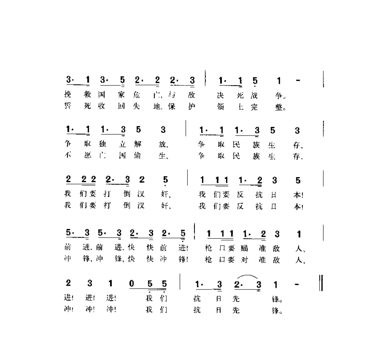 名称:红军抗日先锋 红军歌曲国家:中国分类:曲谱子类:歌谱乐谱类型:简谱/五线谱文件格式:jpg
