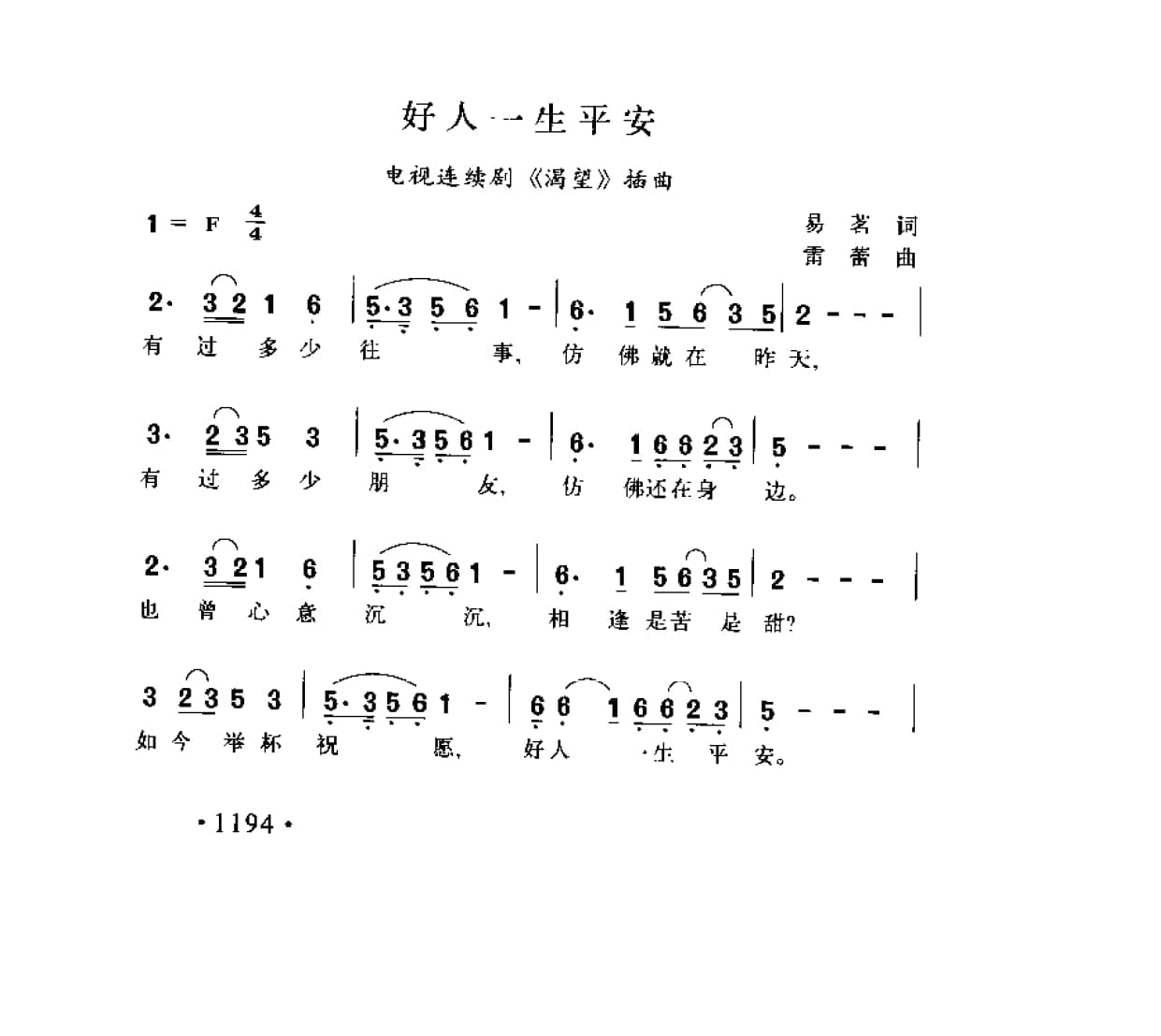 名称:好人一生平安 电视连续剧 渴望 插曲 易茗词 雷蕾曲国家:中国分类:曲谱子类:歌谱乐谱类型:简谱/五线谱文件格式:jpg