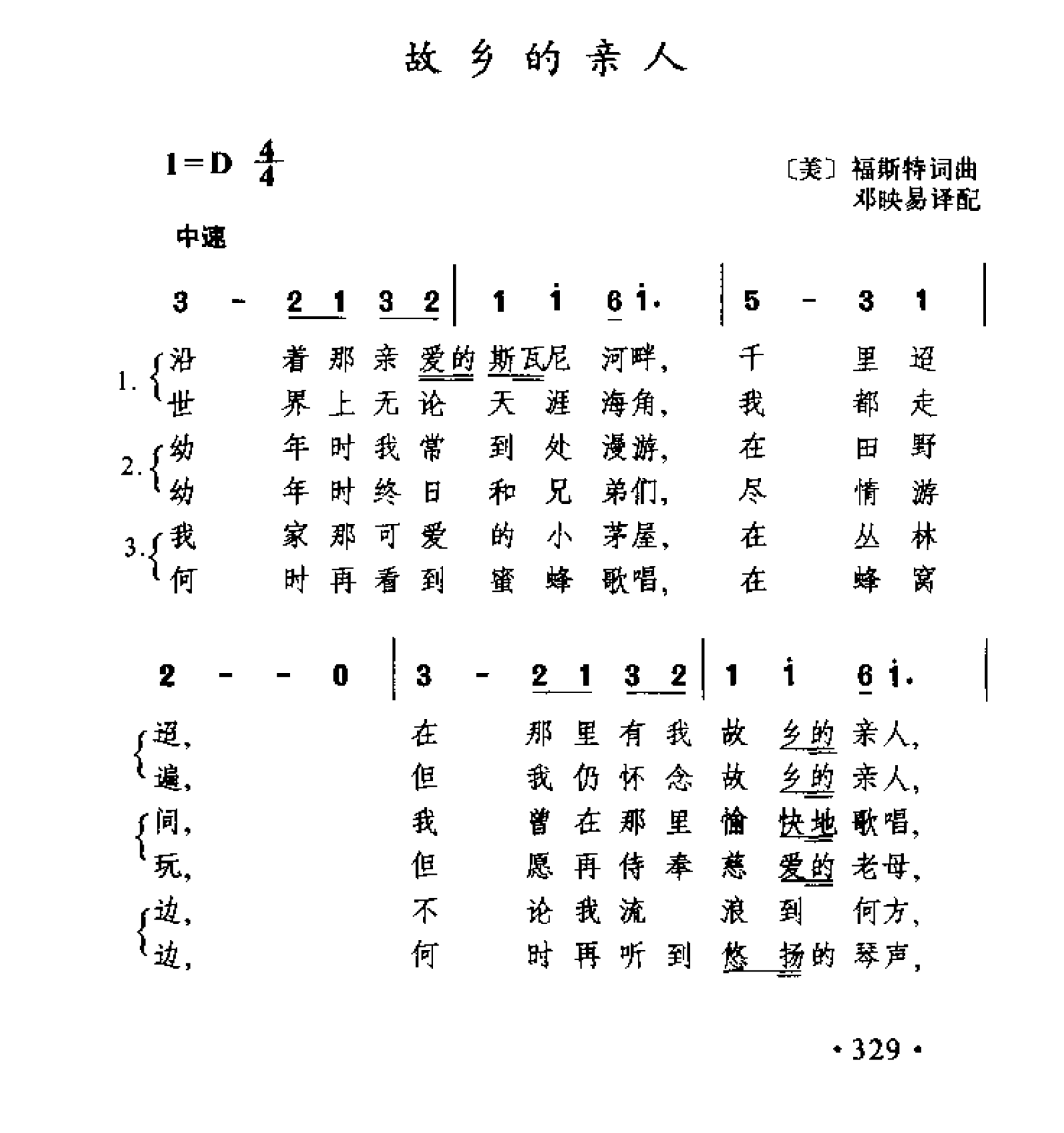 《故乡的亲人》(Old Folks at Home)是美国作曲家斯蒂芬·福斯特(Stephen Foster)于1851年创作的一首经典歌曲,被誉为美国音乐史上最具代表性的民谣之一。以下是关于这首乐曲的简要分析和简谱信息: