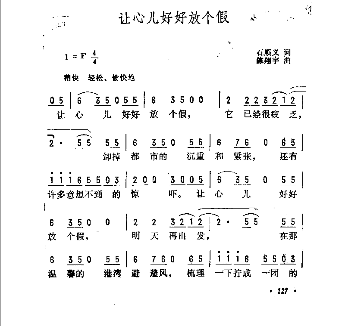 抒情歌曲简谱:让心儿好好放个假 石顺义词 陈翔宇曲