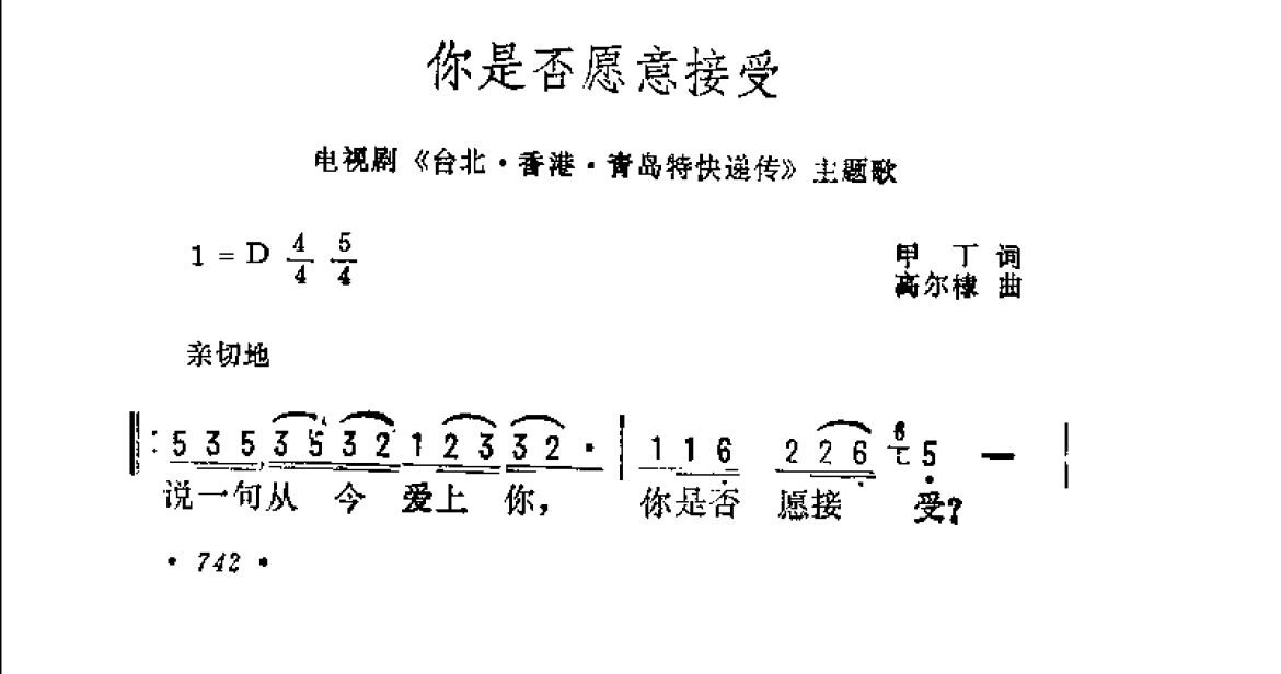 你是否愿意接受(电视剧《台北·香港·青岛特快递传》主题歌)甲丁词 高尔棣曲简谱歌词是曲谱查询网于2025年02月14日 16:41:28更新在乐谱大全频道中的内容,收录在乐谱大全栏目中;曲谱查询网分享的你是否愿意接受(电视剧《台北·香港·青岛特快递传》主题歌)甲丁词 高尔棣曲简谱五线谱高清图片,欢迎在线免费下载;曲谱查询网无需注册,即可直接下载海量歌曲谱与乐器学习相关资料。