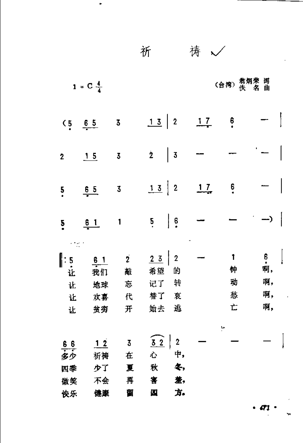祈祷(台湾)翁炳荣词 佚名曲简谱歌词是曲谱查询网于2025年02月13日 14:35:53更新在乐谱大全频道中的内容,收录在乐谱大全栏目中;曲谱查询网分享的祈祷(台湾)翁炳荣词 佚名曲简谱五线谱高清图片,欢迎在线免费下载;曲谱查询网无需注册,即可直接下载海量歌曲谱与乐器学习相关资料。