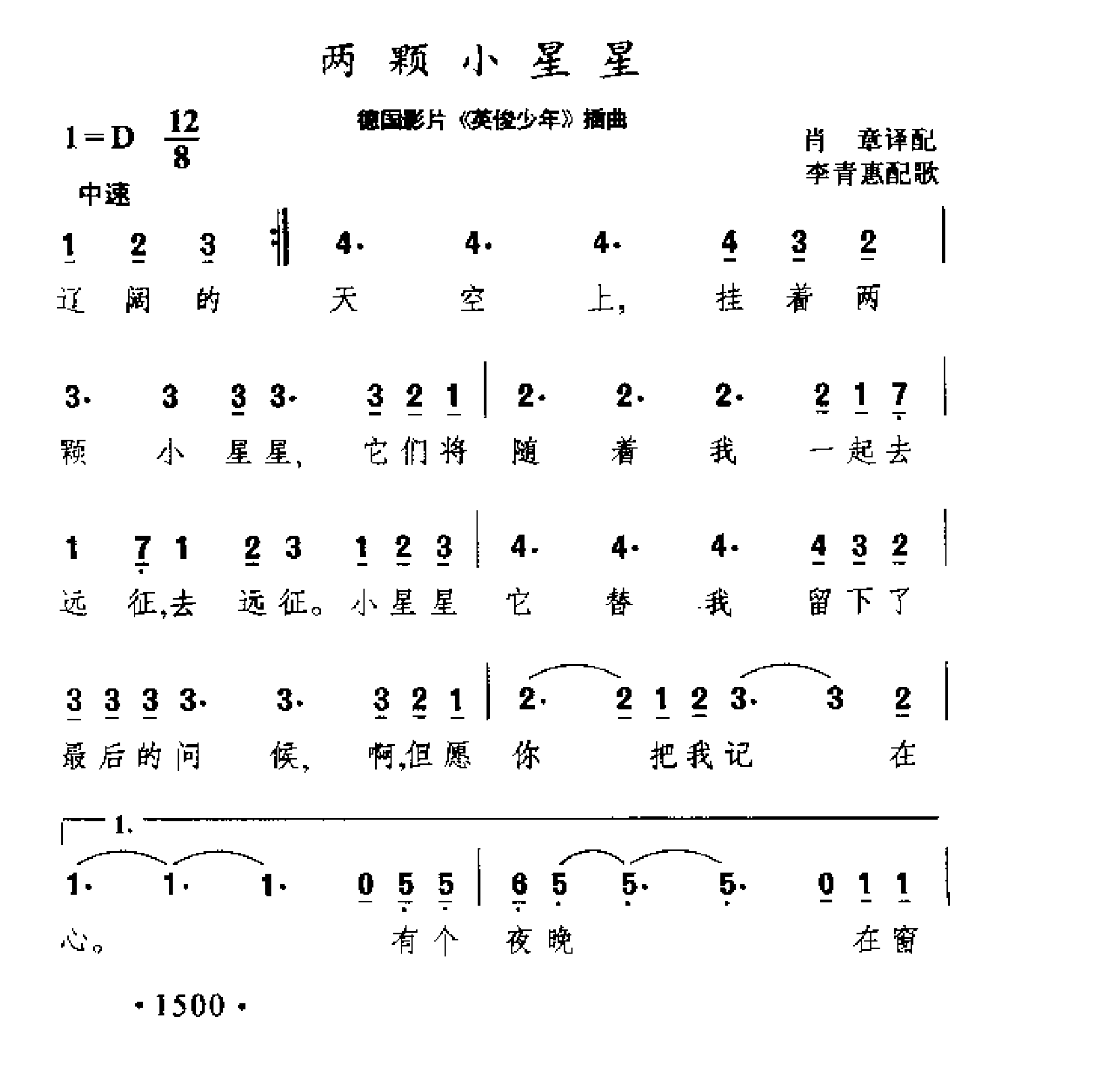 两颗小星星(德国影片《英俊少年》插曲)简谱歌词是曲谱查询网于2025年02月09日 10:03:11更新在乐谱大全频道中的内容,收录在乐谱大全栏目中;曲谱查询网分享的两颗小星星(德国影片《英俊少年》插曲)简谱五线谱高清图片,欢迎在线免费下载;曲谱查询网无需注册,即可直接下载海量歌曲谱与乐器学习相关资料。